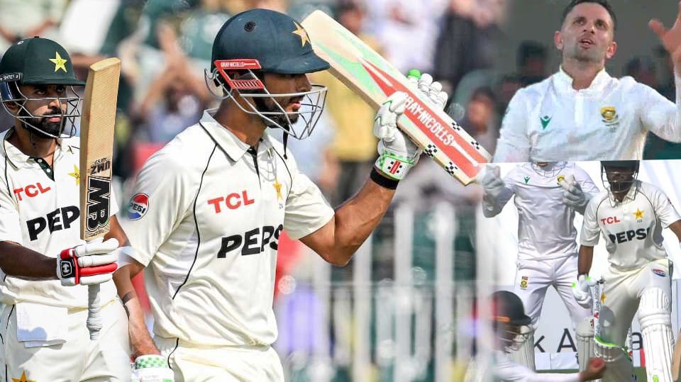 پاکستان کی اننگ کا آغاز اس لئے بھی پرسکون رہا۔جنوبی افریقا کے فیلڈرز نے پہلے اوور سمیت عبداللہ شفیق کے 2 کیچز ڈراپ کردیئے۔ساتھ میں ایک بار وہ یوں خوش قسنت بنے کہ بال وکٹوں کو لگنے کے باوجود بیلز نہ گرنے سے ناٹ آئوٹ ہی رہے۔اتنے مواقع کے باوجود جنوبی افریقا نے پہلی وکٹ 35 کے سکور پر اس وقت حاصل کرلی جب امام الحق 17 رنزبناکر سپنر ہارمر کی بال پر کلین بولڈ ہوئے۔شان مسعود آئے اور آج کے خوش قسمت بیٹر عبد اللہ شفیق کے ساتھ سکور کو 35 سے 146 تک لے گئے۔111 رنز کی اہم شراکت بھی یہاں ہارمر نے توڑی،جب انہوں نے عبداللہ کو کیچ کرواہی دیا۔انہوں نے146 بالز پر 57 رنزکی اننگ کھیلی۔21 رنز کے اضافہ سے سب کی نگاہ میں رہنے والے بابر اعظم ایک بار پھر فلاپ ہوئے۔167 سکور ہوا تھا کہ وہ 16 رنزبناکر کیشو مہاراج کی بال پر ڈی زورزی کے ہا تھوں کیچ ہوئے۔وہ 3 سال سے ٹیسٹ سنچری سے محروم چلے آرہے ہیں۔سعود شکیل آئے تو سیٹ بیٹر شان مسعود کے ساتھ پاکستان کو ریسکیو کیا لیکن پاکستانی کپتان شان مسعود یوں بد قسمت بنے کہ ایک بار پھر سنچری سے محروم رہے۔وہ 176 بالز پر 87 رنزکر کے آئوٹ ہوئے،انہوں نے 3 چھکے اور 2 چوکے لگائے،ان کی وکٹ مہاراج نے لی۔پاکستان کا سکور اس وقت 212 ہو اتھا۔،246 کے سکور پر محمد رضوان 19 رنزبناکر وکٹ دے گئے۔وہ پیسر راباد کی بال پر ایل بی ہوئے۔